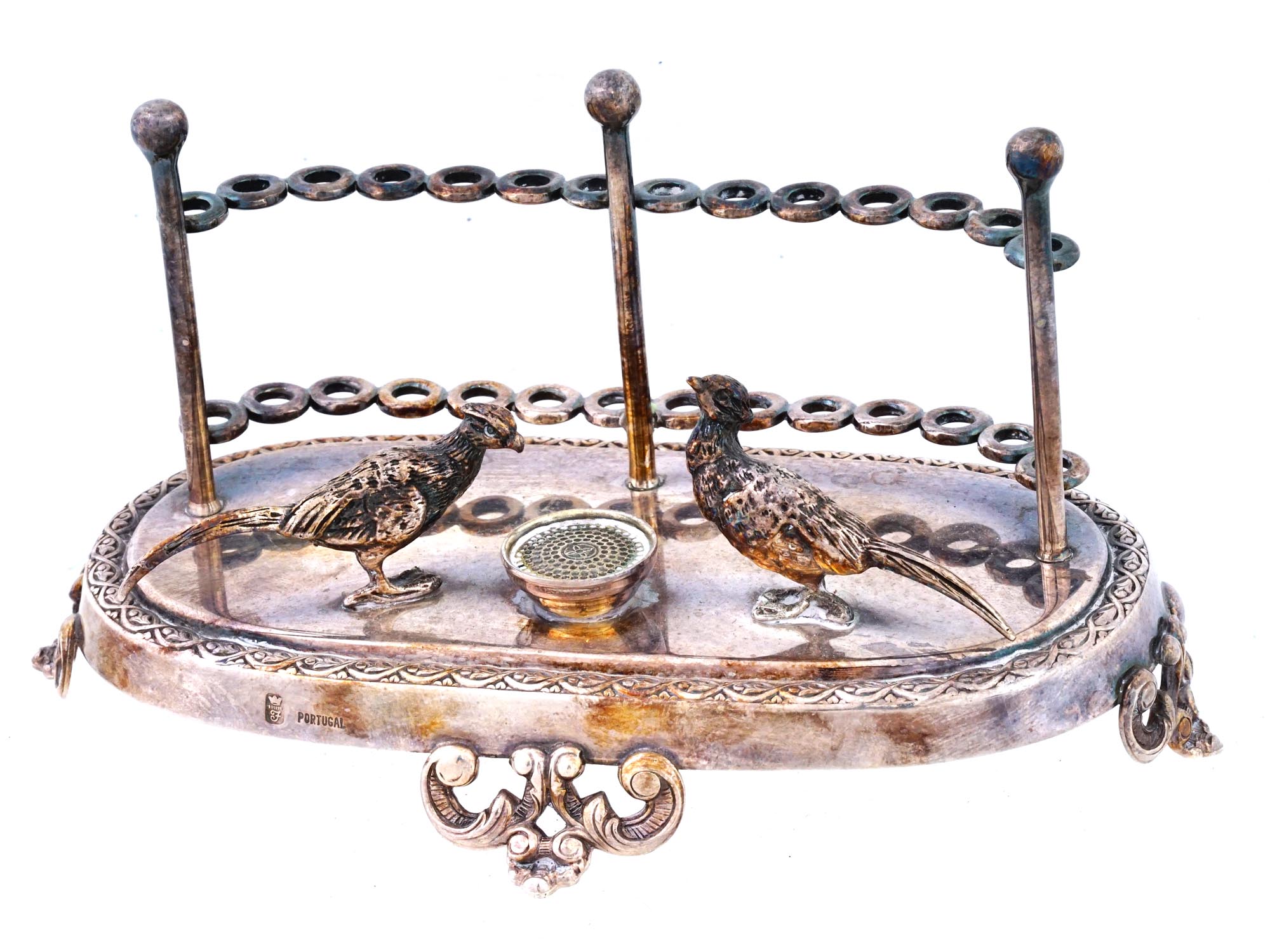 An antique Portuguese 835 silver toothpick holder, a delightful piece that captures the essence of both functional utility and artistic elegance. Crafted with precision and attention to detail, this toothpick holder stands as a testament to the skillful hands of Portuguese silversmiths. The holders design features two intricately depicted birds, creating a harmonious and decorative composition. Hallmarked. Circa the late 19th century. Weight: 149 g. Antique Portuguese Silverware Collectibles.
